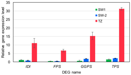 DEGs related to the MEP pathway’s enzymes (Figure 5; Table S6), from 1-deoxy-D-xylulose 5-phosphate synthase (DXS) all the way to geranylgeranyl diphosphate synthase (GGPS), were up-regulated about 9- to 352-fold in TZ compared to that in SW-1 or SW-2. This indicated that more basic C5 units, IPP and DMAPP, might be provided down-stream in the pathway for biosynthesis. Two terpene synthase (TPS)-encoding DEGs were also up-regulated about 22- to 415-fold in response to the biosynthesis of the diterpenoids and other secondary metabolites. Similarly, DEGs related to the MVA pathway’s enzymes (Figure 5; Table S6), from thiolase all the way to farnesyl diphosphate synthase (FPS), were also up-regulated from SW-1 and SW-2 toward TZ. Because the MVA pathway also includes isopentenyl diphosphate isomerase (IDI) and TPSs, we cannot rule out the possibility that DEGs annotated as IDI and TPSs previously included in the plastid-localized MEP pathway might also involve in the non-plastid localized MVA pathway. Hence, the true subcellular localizations of these annotated DEGs (IDI and TPSs) would require further experimental confirmation. Overall, the DEGs of the MVA pathway were up-regulated about 10- to 106-fold in TZ compared SW-1 or SW-2. Again, this also indicated that more basic C5 units might be provided for down-stream biosynthesis of sesquiterpenoids and other compounds. Four DEGs from these two pathways were validated by quantitative reverse transcription polymerase chain reaction (qRT-PCR). The results (Figure 6) indicated that DEGs related to IDI, FPS, GGPS and TPS were highly expressed in TZ compared to SW tissues. Taken together, all of these highly expressed DEGs from both pathways in TZ contributed to the gradual accumulation of the terpenoids from TZ toward HW tissues in Taiwania stems. However unlike Taiwania, research in sandalwood (Santalum album), a hardwood species, has revealed that transcripts related to the MEP pathway were preferentially expressed in SW, whereas transcripts related to the MVA pathway, FPS and a subset of TPS responsible for sesquiterpenoid biosynthesis, were preferentially expressed in HW [28]. Unique living ray parenchyma cells in HW were implied to be involved in the sesquiterpenoid biosynthesis in sandalwood [16]. In the case of Taiwania, there are no living ray parenchyma cells distributed in HW region (Figure 1b), and hence, this reflects the diverse and complex terpenoid biosynthesis in HW formation from different tree species.