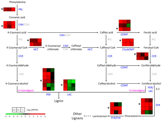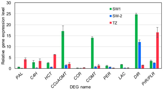 With the aid of dirigent proteins (DIRs), two dehydrogenated coniferyl alcohols are radical coupled to form pinoresinol. Pinoresinol reductase (PrR) or pinoresinol lariciresinol reductase (PLR) further reduce pinoresinol into lariciresinol or secoisolariciresinol [33]. Finally, with the aid of other lignan-biosynthetic enzymes, other lignans, including taiwanin A, savinin, and helioxanthin, are biosynthesized. Only one DIR- and two PrR/PLR-encoding DEGs were up-regulated in TZ compared SW-2, and the expression levels of all other DIR- or PrR/PLR-encoding DEGs were down-regulated in TZ (Figure 7; Table S6). These three up-regulated DEGs are likely specific to the HW formation process, and provide the precursors for the subsequent lignan biosynthesis. Several DEGs from lignin and lignan biosynthesis pathways were randomly selected and further validated by qRT-PCR. The results (Figure 8) indicated that the expression patterns of selected genes validated from qRT-PCR generally match with the expression patterns from the transcriptome data, and the selected LAC and PrR/PLR genes did up-regulate in TZ compared SW-2 (Figure 8). These two genes, together with other monolignol biosynthesis-related DEGs expressed in TZ, might contribute to the gradual accumulation of the lignans in TZ of Taiwania stems during the HW formation process. In a transcriptome study of Scots pine (P. sylvestris) [27], researchers have shown that the elevated expression levels of PAL-, 4-coumarate CoA ligase (4CL)- and stilbene synthase-encoding transcripts led to stilbene biosynthesis in TZ and the accumulation of stilbene in HW. Similar results were also reported for eastern black walnut (J. nigra) and black locust (R. pseudoacacia), the accumulation of flavonoids in the TZ region were correlated to the elevated gene expression levels of chalcone synthase, flavanone-3-hydroxylase, and dihydroflavonol 4-reductase [22,25]. All these support the notion that biosynthesis of these phenolic compounds are activated in TZ during the HW formation process.