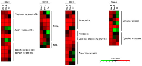 HW formation has been suggested as a special type of tissue senescence, and the PCD of ray parenchyma cells during HW formation shares some similarity to the PCD of xylem tracheary elements (TEs) [3,15,39]. In Taiwania’s TZ, ray parenchyma cells gradually lose their vitality (Figure 1b) and cellular contents [17]. DEGs encoding nucleases and vacuolar processing enzyme (VPE) were highly expressed in TZ with about 8- to 85-fold changes compared to SW-1 or SW-2 (Figure 9; Table S6). Both nucleases and VPEs have been reported as actively involved in regular plant PCD and TE differentiation [43,44], and the plant PCD process also harbors aspartic, serine, and cysteine protease activities in the autolytic process [43,45]. Aspartic protease-encoding transcripts were detected in our DEGs. However, most of them were down-regulated in TZ compared to SW-1 or SW-2, except one in TZ showing elevated expression levels (2.7-fold) compared to SW-2 (Figure 9; Table S6). This up-regulated aspartic protease-encoding DEG is likely associated with the up-regulated bHLH TF-encoding DEG involved in PCD during the HW formation process. However, the true association between these two genes awaits further investigation.