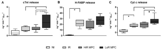 Markers of cellular (cardiac troponin I (cTnI) and heart-type fatty acid binding protein (H-FABP)) and mitochondrial (cytochrome c (cyt c)) damage were measured at 10 min reperfusion. Release of cTnI, H-FABP and cyt c appeared greater in IR vs. NI hearts, but reached statistical significance only for H-FABP and cyt c (p < 0.05 for both, p = 0.1104 for cTnI; Figure 2). LoR MPC hearts, but not HiR MPC hearts, released more cyt c and cTnI compared to IR (p < 0.05 for both). Furthermore, a significantly greater cyt c release (p < 0.05) as well as a tendency for a greater cTnI and H-FABP release (p = 0.0555 and p = 0.1293 respectively) were observed in LoR vs. HiR MPC hearts.
