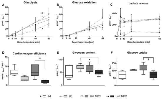 Post-ischemic metabolic recovery. (A) Rates of glycolysis; (B) Rates of glucose oxidation; (C) Lactate accumulation (net change) in recirculating perfusate; (D) Oxygen efficiency [LV work/oxygen consumption] at 15 min reperfusion; (E) Glycogen content at 60 min reperfusion; (F) Glucose uptake (calculated) at 60 min reperfusion. HiR, high recovery; IR, ischemia reperfusion; LoR, low recovery; MPC, mechanical postconditioning; NI, no ischemia. Data are expressed as mean ± standard deviation (A–C) or as median, 25–75 percentiles and range (D–F). * p < 0.05 vs. IR, ⱡ p < 0.05 LoR MPC vs. HiR MPC (n = 4–11/group).