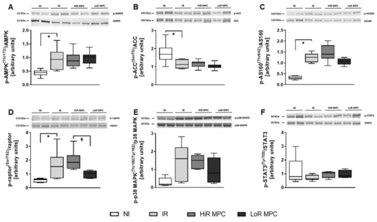 Activation of key signaling molecules—AMPK and Survivor Activating Factor Enhancement (SAFE) pathway. Representative Western blots for phosphorylated and total proteins in top panels and ratios of phosphorylated to total proteins for: (A) AMP-activated protein kinase (AMPK) [Thr172]; (B) acetyl-CoA carboxylase (ACC) [Ser79]; (C) Akt substrate of 160 kDa (AS160) [Thr642]; (D) regulatory associated protein of mTOR (raptor) [Ser792]; (E) p38 mitogen-activated protein kinase (p38 MAPK) [Thr180/Tyr182]; (F) signal transducer and activator of transcription 3 (STAT3) [Tyr705]. HiR, high recovery; IR, ischemia reperfusion; LoR, low recovery; MPC, mechanical postconditioning; NI, no ischemia. Data are expressed as median, 25–75 percentiles and range. * p < 0.05 vs. IR, ⱡ p < 0.05 LoR MPC vs. HiR MPC (n = 5–10/group).