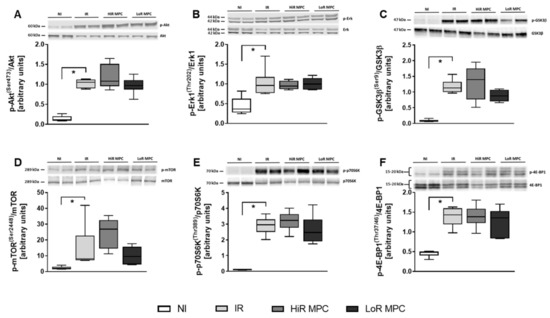 Activation of key signaling molecules—Reperfusion Injury Salvage Kinase (RISK) and mTOR pathway. Representative Western blots for phosphorylated and total proteins in top panels and ratios of phosphorylated to total proteins for: (A) Akt [Ser473]; (B) extracellular signal-regulated kinase 1 (Erk1) [Thr202]; (C) glycogen synthase kinase 3 beta (GSK3β) [Ser9]; (D) mammalian target of rapamycin (mTOR) [Ser2448]; (E) ribosomal protein S6 kinase (p70S6K) [Thr389]; (F) eukaryotic translation initiation factor 4E-binding protein 1 (4E-BP1) [Thr37/46]. HiR, high recovery; IR, ischemia reperfusion; LoR, low recovery; MPC, mechanical postconditioning; NI, no ischemia. Data are expressed as median, 25–75 percentiles and range. * p < 0.05 vs. IR (n = 4–7/group).