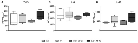 The cardiac content of pro- and anti-inflammatory cytokines was determined at 15 min reperfusion (Figure 6). TNFα and interleukin-6 (IL-6) levels tended to be decreased in HiR MPC hearts compared to LoR MPC hearts.