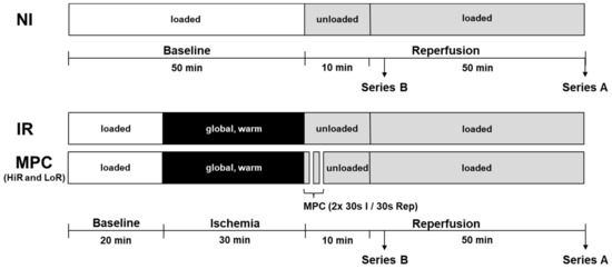 An isolated heart model of DCD heart transplantation was used, as previously reported [26,45,47,53,54], with male Wistar rats (Janvier Labs, Le Genest-Saint-Isle, France) of 10 to 11 weeks of age to ensure mature cardiac metabolism [55] and to represent young, adult human DCD donors. Rats were housed under standard conditions at a controlled room temperature with a 12-h light–dark cycle and access to water and food ad libitum. After random assignment to experimental groups (in alternating fashion), the rats were anaesthetized intraperitoneally using 100 mg/kg ketamine (Narketan®, Vetoquinol AG, Bern, Switzerland) and 10 mg/kg xylazine (Xylapan®, Vetoquinol AG, Bern, Switzerland). As soon as the pedal reflex had disappeared, the hearts were excised and cannulated on the perfusion system. Series A: Hearts first underwent 20 min of baseline working mode perfusion with modified KHB buffer (containing 118 mM NaCl, 4.7 mM KCl, 1.2 mM KH2PO4, 1.25 mM CaCl2·2H2O, 1.2 mM MgSO4·7H2O, 25 mM NaHCO3 and 11 mM glucose, supplemented with 1.2 mM palmitate/3% BSA and 0.5 mM lactate; gassed with 95% O2- 5% CO2). Thereafter, hearts were subjected to 30 min global, no-flow, normothermic (37 °C) ischemia. The first ten minutes of reperfusion following ischemia were performed in Langendorff/unloaded mode; subsequently the hearts were switched to working mode for the following 50 min reperfusion (reperfusion buffer: modified KHB buffer without addition of palmitate/BSA and lactate; Figure 8). Following ischemia, hearts were either subjected to mechanical postconditioning (MPC; two cycles of 30 s reperfusion/30 s ischemia), or directly reperfused (ischemia reperfusion, IR). In addition, a non-ischemic control group (no ischemia, NI) was generated by prolonging the aerobic, baseline perfusion conditions for the equivalent time of ischemia, followed by reperfusion as described above. Series B: Hearts were perfused using the three protocols described above, but stopped after a total of 15 min reperfusion for molecular analyses. For glycogen content measurements, an additional group of hearts was stopped directly after ischemia.