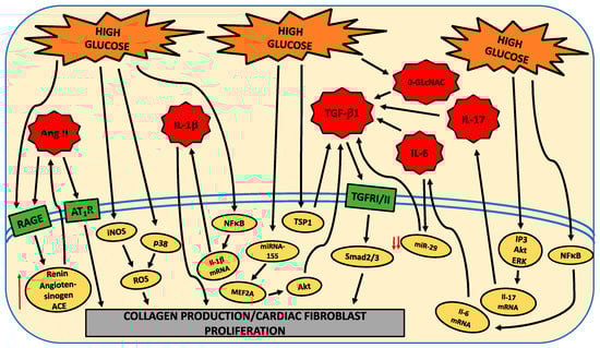 - Singh, V.P.; Baker, K.M.; Kumar, R. Activation of the intracellular renin-angiotensin system in cardiac fibroblasts by high glucose: Role in extracellular matrix production. Am. J. Physiol. Heart Circ. Physiol. 2008, 294, H1675–H1684. [Google Scholar] [CrossRef]