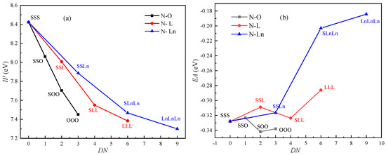 As shown in Figure 1a, the IPs decrease as the number of C=C increases. The IP and EA of ten kinds of triglycerides were calculated: N-SSS, N-SSO, N-SOO, N-OOO, N-SSL, N-SLL, N-LLL, N-SSLn, N-SLnLn and N-LnLnLn. The rate of decline for the IPs of the triglycerides that included monounsaturated fatty acids is slightly higher than that of the triglycerides that included polyunsaturated fatty acids. The difference in IP between the N-SSS and N-LnLnLn is 1.12 eV. The decrease in triglyceride IP caused by an increase in DN is not linear. Initially, the IP decreases almost linearly, but the decline in IP tends to be flat as the number of C=C increase. Figure 1b shows the effect of C=C on the EA of triglycerides. The value of EA fluctuates as DN increases. The influence of C=C on the EA is small, as indicated by the small variation range of EA (0.16 eV).