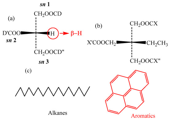 Triglycerides are the main constituents of NEO. Figure 2a shows the molecular geometry of triglycerides with β-H, which significantly lowers the oxidation stability of NEO [3,31,32]. The D, D’ and D” in the molecule represent the fatty acids, which always contain C=C. The different stereochemical positions (sn-1, 2 or 3) on the glycerol backbone are the locations corresponding to the three fatty acids. N-DD’D” is used to represent the triglycerides, and the “N” stands for natural ester. For example, N-OOO corresponds to the glycerol tri-oleate for the NEO. Table 2 shows the abbreviations for different types of fatty acids.