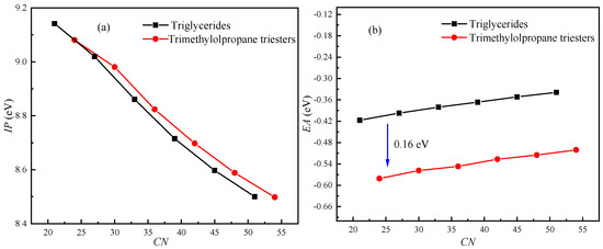 As shown in Figure 3a, β-hydrogen has little effect on IP. At the same CN, the triglycerides with β-hydrogen have a lower IP compared with that of trimethylolpropane triester (without β-hydrogen). The difference in IP between triglycerides and trimethylolpropane triester increases as the CN increases from 21 to 54. As the chain length increases, the IP of the molecule decreases. The IP decreases by approximately 7% as CN increases from 21 to 54. Therefore, the effect of chain length on the IP is significant. As shown in Figure 3b, the EA increases approximately linearly with increasing of the chain length. The EA of triglycerides with β-hydrogen is approximately 0.16 eV higher than that of trimethylolpropane triester without β-hydrogen.