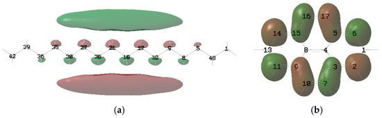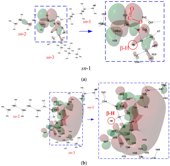 Koopman’s theorem can be used to roughly estimate the IP and EA of the molecule. According to Koopman’s theorem, the HOMO represents the molecule’s ability to donate an electron, and LUMO, as an electron acceptor, represents the molecule’s ability to obtain an electron; that is, for the isosurface of the HOMO of the molecule, the greater the contribution of the atom to the HOMO, the more likely it is that ionization will occur around it. Therefore, to clarify the influence of C=C and β-hydrogen on the IP and EA, it is necessary to analyze the HOMO and LUMO of the molecules (Figure 4). Stearic, oleic and linoleic fatty acids exist in N-OSLn. Therefore, analyzing the contribution of the atoms of N-OSLn (Figure 4a) can clearly clarify the phenomenon in which the rate of decline for the IPs of the triglycerides with monounsaturated fatty acids is slightly higher than that of triglycerides with polyunsaturated fatty acids (Figure 1a).