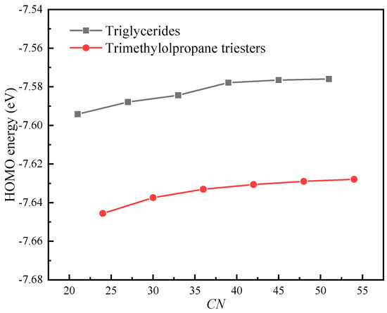 Figure 6 shows The HOMO energies of triglyceride molecules (N-CoCoCo, N-CyCyCy, N-CrCrCr, N-LaLaLa, N-MMM and N-PPP) and trimethylolpropane triester molecules (T-CoCoCo, T-CyCyCy, T-CrCrCr, T-LaLaLa, T-MMM and T-PPP). It is noted that the HOMO energies of the molecules are negative and increase slightly as CN increases, and the triglycerides have a higher HOMO energy compared with that of trimethylolpropane triester at the same CN. Koopman’s theorem holds that the IP of a molecule is equal to the opposite number of the HOMO orbital energy level of the molecule. The basic premise of Koopman’s theorem is that it assumes that the molecular orbital is not affected by the electrons escaping from the molecule; that is, it is assumes that the molecular orbital energy level does not change when the molecule loses an electron. However, in general, when a molecule gains or loses electrons, its HOMO energy is usually strongly affected. Therefore, the IPs obtained by Koopman’s theorem are usually inaccurate. However, Koopman’s theorem does reveal the negative correlation between the IP and the energy of the HOMO. Therefore, the IPs of molecules will increase slightly as CN increases, which clarifies why the IPs of the molecules decrease with an increase in CN and why the triglycerides have a lower IP compared with that of trimethylolpropane triester at the same CN (cf. Figure 3a).