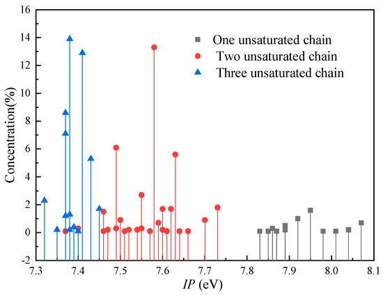 Figure 7 shows the distribution of the IP for FR3. It is observed that the triglyceride molecules in FR3 are divided into three groups: triglycerides with three unsaturated acid chains—that is, the positions sn-1, 2 and 3 are all unsaturated fatty acids, such as N-LLL (three unsaturated chains (Three-U)); triglycerides with two unsaturated acid chains, where two of the sn-1, 2, and 3 positions are unsaturated fatty acids, such as N-SLL (Two-U); and triglycerides with one unsaturated acid chain in which one of the sn-1, 2 or 3 positions is an unsaturated fatty acid, such as N-SSL (One-U). The IP range for One-U triglycerides is 7.83 eV to 8.07 eV, at a concentration of 5.3%. The IP range for Two-U triglycerides is 7.37–7.73 eV, at a concentration of 39.5%, which is higher than that of One-U. The concentration for Three-U with a low IP (7.32–7.45 eV) is the highest (55.2%).