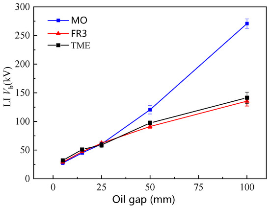 A standard LI voltage 1.2 (±30%)/50 (±20%) µs was applied in point-plane geometries. A tungsten needle electrode with a curvature radius of 100 ± 10 µm was used. The oil gap distance varied from 10 to 100 mm. Although the IP of TME oil is comparable to that of mineral oil, the LI Vb of TME oil is still significantly lower at large gaps (>50 mm) compared with that of MO (Figure 9). The LI Vb of ester insulation oils at a large gap of 100 mm is only half of that of mineral oil. However, there is little difference in LI Vb between FR3 and TME oil without C=C. Therefore, the C=C bond in NEO is not the main factor causing the low LI Vb the at the large gaps. Instead, the ester group in NEOs leads to the low LI Vb of NEO.