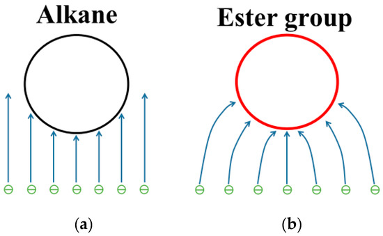 Because the major contribution to LUMO comes from the atoms near the ester group, the ester group in ester insulation oil is impacted by more electrons compared to that of the alkane in MO (Figure 11). At large gaps, impact ionization can play a major role in streamer development. For the ester insulation oil, the voltage needed to generate a large number of electrons is lower than that for MO. Therefore, more electrons and positive ions are generated in ester insulation oil, which leads to their relative ease in producing fast streamers.
