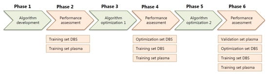 Flowchart of the six phases of the development and optimization of the diagnostic algorithm, with in-between assessments of the performance of the algorithm in the training sets, DBS optimization set and plasma validation set.