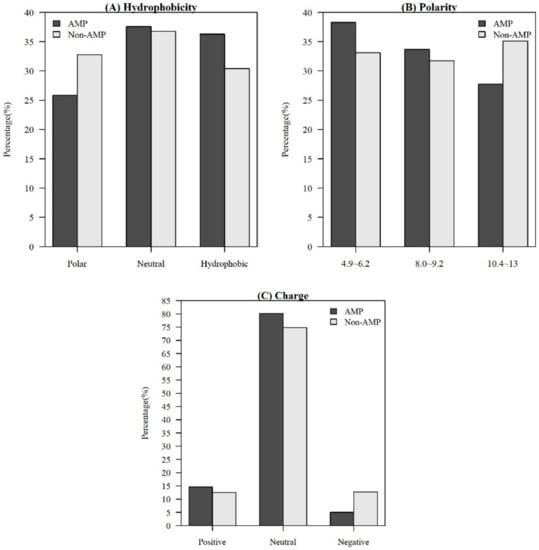Comparisons of physicochemical properties between AMPs and non-AMPs for (A) hydrophobicity, (B) polarity, and (C) charge.