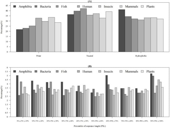 As shown in Table 1, the distribution of AMP sequence lengths among seven categories of organisms indicated that most of AMPs had 20–40 amino acids. Moreover, the number of AMPs with lengths over 100 for human and mammals were much higher than that of other organisms. Figure 4A shows that the AMPs from Amphibia tended to be hydrophobic compared with other organisms. Furthermore, Figure 4B investigates the hydrophobicity of different percentiles of sequence length for each organism. Most of the AMPs from Amphibia, bacteria, insects, and mammals had hydrophobicity in the 90–100th percentile of sequence length. In contrast, the AMPs from humans in the 10–20th and plants in the 30–40th percentiles of sequence length were hydrophobic. Appendix A Figure A4A shows that the percentage of positively charged AMPs was larger than that of the negatively charged AMPs for each category of organism. Appendix A Figure A4B indicates that the positively charged AMPs from Amphibia, insects, and mammals tended to be at larger percentiles of sequence length. Moreover, the distributions of charges in the AMPs from seven organisms are shown in Appendix A Figure A5. We found that the charge distribution was quite different among different organisms. The majority of AMPs from Amphibia had charges between +1 and +4. However, the AMPs from humans and mammals tended to have charges larger than +10 because of the sequence length. Specifically, the number of sequence lengths over 100 from humans and mammals were the largest ones among seven categories of organisms.