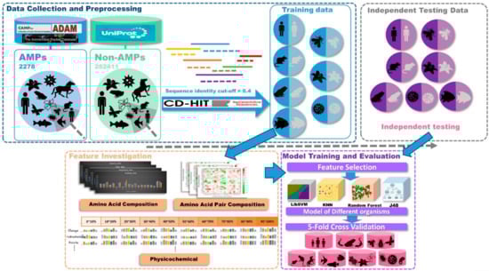 This study was divided into three parts as shown in Figure 7, data collection and preprocessing, feature investigation, and model training and evaluation. At first, positive datasets were collected from several databases. Then, AMPs were classified based on the types of organisms they came from. Negative datasets were downloaded from UniProt. After filtering conditions, all the non-AMPs were classified into seven types of organisms. Then, the sequence analysis tool, CD-HIT, was used to remove sequences that were 40% similar to positive dataset sequences in the negative dataset. The independent testing datasets of each organism were generated by drawing 20% of the data from the corresponding organism dataset. The AAC, amino acid pair composition (AAPC), and physicochemical properties in different sequence lengths of data were included in our feature sets. Then, the feature sets of each organism were analyzed by feature-selection methods to dig out the important features. With these selected features, prediction models were designed by four different kinds of algorithms. Finally, the predictive performances were compared after 5-fold cross validation and independent testing.