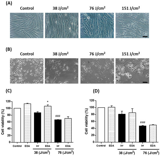 Cell viability changes induced in HDF (A, C) and melanocytes (B, D) exposed to artificial blue light and EDA pre-treatment. Cells were incubated with EDA 0.1 mg/mL for 24 h and then irradiated at the indicated doses. Cell viability was evaluated by MTT assay performed 24 h after irradiation (n ≥ 3). Data were expressed as % of control cells. Data are shown as mean ± standard error of the mean (SEM). ### p < 0.001 vs control cells and * p < 0.05 vs the corresponding irradiated (Irr) cells. Scale bar: 50 µm.