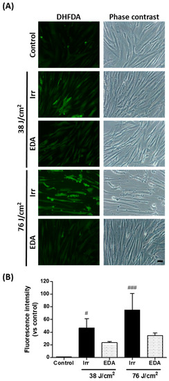 Oxidative stress in human fibroblasts exposed to artificial blue light and EDA pre-treatment. Oxidative stress was evaluated by DHFDA assay. Cells were incubated with EDA 0.1 mg/mL for 24 h, loaded with DHFDA, irradiated at 38 and 76 J/cm2, washed and observed under the microscope immediately after irradiation. ROS are evidenced by green fluorescence in HDF exposed to artificial blue light and EDA (A). Quantification of DHFDA by fluorescence (n ≥ 5) (B). Data are shown as mean ±SEM. # p < 0.05, ### p < 0.001 vs control. Scale bar: 50 µm.