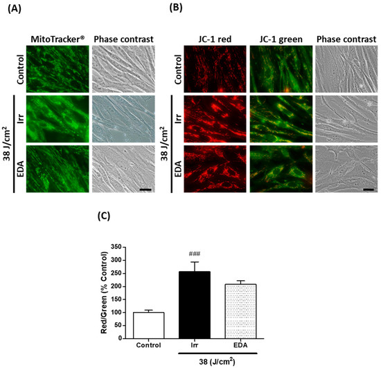 We used the fluorescent probe MitoTracker® green to document mitochondrial morphology (Figure 3A). Non-irradiated control HDF presented elongated mitochondria homogeneously distributed throughout the cells’ cytoplasm. Mitochondria of HDF irradiated at 38 J/cm2, on the other hand, were much shorter or even showed a round-shaped, almost granulated appearance. Cells treated with EDA prior to irradiation were mostly elongated, showing protection against the damaging effects of blue light on mitochondria morphology.