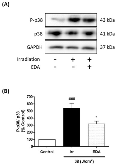 Phosphorylation of p38 in HDF exposed to artificial blue light and EDA pre-treatment. Phosphorylation of p38 was evaluated by WB. Cells were incubated with EDA 0.1 mg/mL for 24 h, irradiated and proteins extracted 1 h after irradiation. Representative immunoblots (A) and quantification plot (B) are shown (n ≥ 3). Data were expressed as % of control cells. Data are shown as mean ± SEM. ### p < 0.001 vs control; * p < 0.05 vs irradiated cells.
