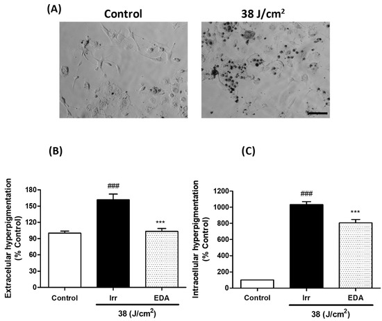 Extracellular and intracellular hyperpigmentation in melanocytes exposed to artificial blue light and pre-treatment with EDA. Microphotographs show how control and irradiated melanocytes have different amounts of melanin dark granules (A). Cells were incubated with EDA 0.1 mg/mL for 24 h, irradiated (38 J/cm2), fresh medium replaced and extracellular (B) and intracellular (C) melanin pigments collected, solubilized and quantified 3 h later by absorbance measurements (n ≥ 4). Data were normalized by mg protein and expressed as % of control cells. Data are shown as mean ±SEM. ### p < 0.001 vs control; *** p < 0.001 vs irradiated. Scale bar: 50 µm.