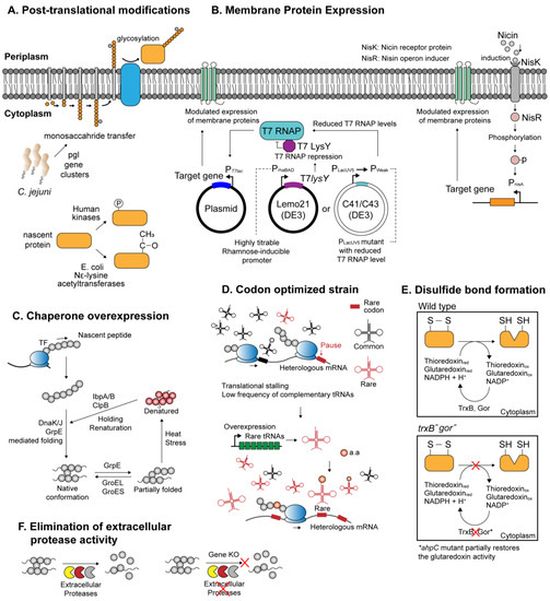 Notable characteristics of microbial chassis. (A) Post-translational modification systems involving glycosylation, phosphorylation, and acetylation; (B) various protein expression systems catered for the expression of membrane proteins; (C) simplified mechanism of the peptide folding mediated by the molecular chaperones; (D) expression system optimized for the expression of the heterologous proteins with high rare codon frequencies; (E) genetically engineered E. coli strain (trxB-, gor-) enabling the formation of disulfide bridges within the cytoplasm; (F) increasing recombinant protein yield by genetically deleting extracellular protease genes.