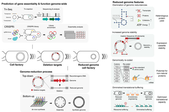 The essence of genome reduction lies in identifying genes that are indispensable for sustaining cell viability. Previous attempts to determine gene essentiality involved a priori predictions derived from in silico comparative genomics in search of homologs and paralogs among remotely related species [150] or systematic inactivation of individual genes from the bacterial genome [151,152]. However, these line of efforts to define essential genes only remained a partial success, as it turned out that evolutionary gene conservation is a poor indicator of gene essentiality [150], and that the nature of gene essentially is highly condition-specific, rendering it almost infeasible to determine using the earlier experimental designs that are extremely time-consuming and laborious [151,152]. Today, the construction of minimal genome is usually accompanied by high-throughput techniques such as transposon mutagenesis sequencing (Tn-Seq) or CRISPR-dCas9, which present a reliable systems-level reference on genome-wide gene essentiality information (Figure 2) [153,154], allowing rational selection of genomic regions for targeted removal. Genome reduction then serves as a testbed to further evaluate the essentiality of the targeted genes or genomic regions and classify them into subcategories in accordance with resulting cellular viability and changes in growth rates ensuing from the targeted deletion (Figure 2) [116].