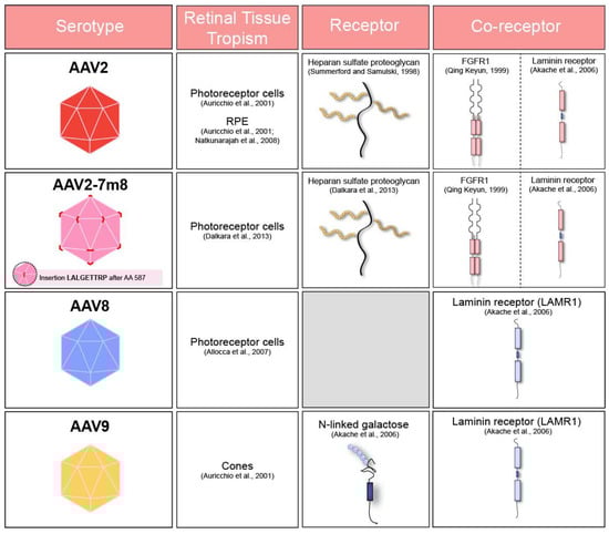 Table summarizing adeno-associated virus (AAV) receptors, co-receptors and cell tropism of commonly used serotypes after subretinal administration in murine [23,24,25] and primate retina [26]. FGFR1: Fibroblast Growth Factor Receptor 1. LAMR1: Laminin Receptor 1.