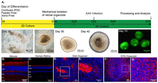 - Quinn, P.M.; Buck, T.M.; Ohonin, C.; Mikkers, H.M.M.; Wijnholds, J. Production of iPS-Derived Human Retinal Organoids for Use in Transgene Expression Assays; Humana Press: New York, NY, USA, 2018; pp. 261–273. [Google Scholar]