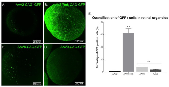 GFP expression as a function of the serotype. Live confocal imaging of representative retinal organoids showing GFP Expression driven by the CAG promoter for the four different tested capsids. (A) AAV2-CAG-GFP. (B) AAV2-7m8-CAG-GFP. (C) AAV8-CAG-GFP and (D) AAV9-CAG-GFP. In all cases, the infections were performed at a viral concentration of 5 × 1010 vg per organoid at day 44 of differentiation. Scale bar: 250 µm. (E) Percentage of GFP positive cells quantified by FACS analysis. N = 3 biological replicates of n = 10 organoids. Values are mean ± SEM. For statistical significance, Mann–Whitney Student’s test was used and ** p < 0.05 was considered significant. n.s. = non significant.