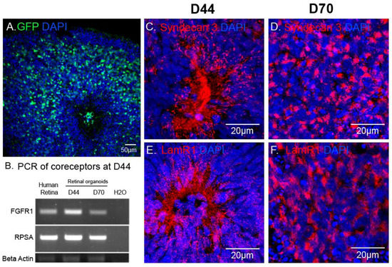 In retinal organoids, the most efficient capsid was AAV2-7m8 (Figure 3). To explain this observation, we asked which AAV cell surface receptors and co-receptors were found in the retinal organoids at the timepoint of infection. Using immunohistochemistry and RT-PCR, we looked at the expression of the different AAV receptors and co-receptors within retinal organoids at the day of infection (day 44) and at day 70 of differentiation (Figure 4). Heparan sulfate proteoglycan (HSPG) is the primary cell surface attachment receptor for the rAAV2 and 2-7m8 capsid variants. Members of the family of HSPG, also known as N-Syndecans, are most abundantly found in neural tissue and are involved in the formation of retinal neural networks [28,29]. We therefore investigated the presence of these syndecans (namely syndecan-3), as well as the co-receptor Laminin Receptor 1, in day 44 retinal organoids in relation to GFP expression patterns observed with AAV2-7m8 (Figure 4A). In addition to Laminin receptor 1 (encoded by the RPSA gene), FGFR1 also acts as co-receptor for rAAV2 and likely the AAV2-7m8 capsid. The expression of both co-receptors was established by RT-PCR experiments (Figure 4B). Syndecans were found around the rosettes where the photoreceptor precursors are normally found (Figure 4C,D and Figure S1). These rosettes disappeared after the addition of DAPT, a gamma secretase inhibitor that selectively blocks the Notch signaling pathway and promotes the organization of photoreceptors into a layer in the outer part of the organoid. Syndecan and Laminin Receptor 1 expression was sustained at least until Day 70 (Figure 4C,D). The abundant expression of its receptors likely contributes to the transduction efficacy observed with AAV2-7m8 in retinal organoids. On the other hand, despite the presence of its receptors, AAV2 was a lot less efficacious for the transduction of retinal organoids. This might be explained by the higher rate of cell entry observed by AAV2-7m8 compared to its parental serotype AAV2 [17].