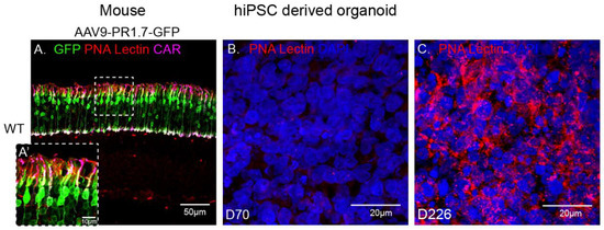 rAAV9 has successfully been used to deliver genes to cones in non-human primates [30,31] and in mice thanks to the abundant presence of its primary receptor N-linked galactose in cone cells (Figure 5A). Surprisingly, in our experiments, AAV9 showed a low transduction efficiency towards our cone-enriched human retinal organoids. This observation was corroborated with the undetectable presence of N-linked galactose in these organoids at the time of infection (data not shown) and at later timepoints up to day 70 (Figure 5B). We hypothesized that this lack of N-linked galactose might be due to the lack of outer segment structures where this glycan is normally found in mature retinas (Figure 5A). We therefore examined iPSC derived retinal organoids at a much later stage of 226 days of differentiation. Indeed, PNA lectin staining revealed abundant N-linked galactose in hiPSC-derived retinal organoids at this advanced differentiation stage, suggesting that this glycan is expressed only as the retinal photoreceptors mature, even in the absence of outer segments (Figure 5B,C). It is interesting to note that PNA lectin is confined to the cone cell body in the absence of outer segment formation in these 226 day-old organoids. The absence of GFP expression in retinal organoids at Day 70 is thus explained by the absence of rAAV9’s main receptor at this early stage.
