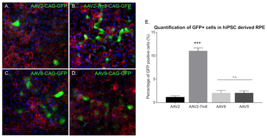 Our 3D retinal organoids consist in neural retina. In order to determine the most efficient AAV capsids in RPE cells derived from hiPSC (hi-RPE), we first differentiated RPE cells using a previously established protocol [27]. hi-RPE cells were fully characterized for the major markers of RPE lineage using specific markers (Figure S4). By D63 of differentiation, hi-RPE cells exhibited the typical cobblestone shape and were immunoreactive for the RPE-specific transcription factor MITF, and the tight and adherens junction marker ZO-1. Additionally, the phagocytosis marker, FAK, was detected (Figure S4). We optimized the AAV-mediated transduction of hi-RPE cells at passage 2 (P2) and passage 3 (P3). A semi-automated image analysis system was used to determine the percentage of GFP immunoreactive cells from digital images after the transduction (Figure 6A–D). Four different AAV capsids were tested, with the AAV2-7m8 variant achieving a higher rate of transduction in comparison with rAAV2, 8 and 9 (Figure 6E).
