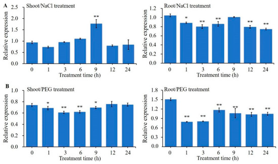 Expression patterns of ZmBES1/BZR1-5 from qRT-PCR. The three-leaf stage of B73 seedlings were exposed to a water solution supplemented with 250mM NaCl (A) and 16% PEG-6000 (B). All values are means (±SE) of three biological replicates. The ZmGAPDH gene was used as internal reference. The relative expression level was calculated and normalized using the 2−ΔΔCT method of the CFX Manger™ software version 2.0 (Bio-Rad, Berkeley, CA, USA). * p < 0.05 and ** p < 0.01 by Student’s t test, respectively.