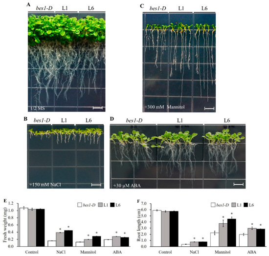 Phenotypes of bes1-D, L1 and L6 lines under optimal conditions (A), 150mM NaCl (B), 300 mM mannitol (C) and 30 μM abscisic acid (ABA) (D). Quantification of fresh weight (E) and root length (F) of every line grown on 1/2× MS medium plates for three weeks. All values are means (±SE) of three biological replicates. bes1-D, L1 and L6 represent either an untransformed mutant or two homozygous T3 lines. * represents p < 0.05 by Student’s t test. Scale bars = 0.5 cm.