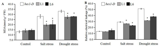Malondialdehyde (MDA) content and relative electrolyte leakage (REL) are widely used as indicators when evaluating plant tolerance to abiotic stresses. Here, before salt and drought stress, there was no significant difference (p > 0.05) in MDA content and REL between the bes1-D mutant and transgenic lines. However, after treatment, the MDA content and REL of L1 and L6 lines was significantly lower (p > 0.05) compared to the bes1-D mutant, although the MDA content and REL of all plants increased after salt and drought treatment (Figure 5).