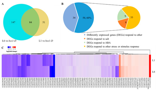 Identification of differently expressed genes (DEGs) in the L1 and L6 lines compared with the untransformed bes1-D mutant. (A) Venn diagram of DEGs. (B) The category of DEGs. (C) Heatmap of DEGs.