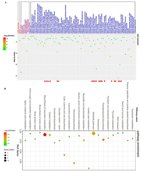 Gene ontology (GO) analysis (A) and KEGG enrichment analysis (B) of common DEGs in the L1 and L6 lines compared to the bes1-D mutant. The red triangle in Panel A indicates the stress or stimulus response.