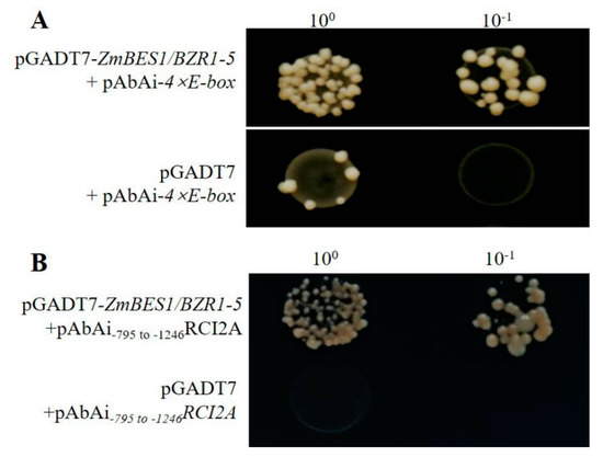 DNA binding assay using Y1H. (A) Y1H between the E-box and ZmBES1/BZR1-5. (B) Y1H between the −795 to −1246 promoter of the RCI2A gene and ZmBES1/BZR1-5.