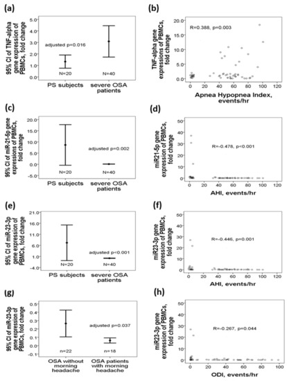 Upregulations of miR-21-5p/miR-23a-3p and downregulation of TNF-α in patients with treatment-naive obstructive sleep apnea. TNF-α gene expression was (a) increased in OSA patients, and (b) positively correlated with apnea hyponea index. miR-21-5p gene expression was (c) decreased in OSA patients, and (d) negatively correlated with apnea hypopnea index. miR-23a-3p gene expression was (e) decreased in OSA patients, negatively correlated with (f) apnea hypopnea index/(h) oxygen desaturation index, and (g) further decreased in those with morning headache.