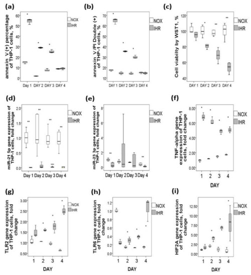 Downregulations of miR-21-5p/miR-23a-3p and upregulations of their predicted genes along with increased apoptosis in response to intermittent hypoxia with re-oxygenation (IHR) stimuli versus normoxic (NOX) condition in THP-1 cells. IHR in vitro for 1–4 days resulted in (a) increased early apoptosis marker, (b) increased late apoptosis marker, (c) decreased cell viability, (d) decreased miR-21-5p expression, (e) decreased miR-23a-3p expression, (f) increased TNF-α, (g) increased TLR2, (h) increased TLR6, and (i) increased HIF2-α gene expressions. * p < 0.05, compared between IHR and NOX condition by Mann–Whitney test; ** p < 0.01, compared between IHR and NOX condition by Mann-Whitney test.