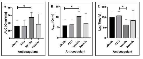 - Wallén, N.H.; Ladjevardi, M.; Albert, J.; Bröijersén, A. Influence of different anticoagulants on platelet aggregation in whole blood; a comparison between citrate, low molecular mass heparin and hirudin. Thromb. Res. 1997, 87, 151–157. [Google Scholar] [CrossRef]