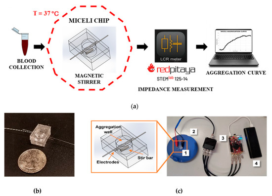 - Santoleri, A.; Dimasi, A.; Consolo, F.; Rasponi, M.; Fiore, G.B.; Slepian, M.J.; Redaelli, A. The MICELI (MICrofluidic, ELectical, Impedance): A New Portable Device for Bedside Platelet Aggregation Measurement. In Proceedings of the ISMCS 2017 25th Anniversary Scientific Congress “Limitations, Controversies, and Gaps in MCS: Pathway to Solutions”, Controversies, Tucson, AZ, USA, 15–18 October 2017; p. 199. [Google Scholar]
