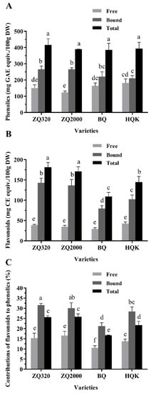 Total phenolic (A) and flavonoid contents (B) and contributions of flavonoids to phenolics (C) of the free, bound, and total fractions of four highland barley varieties (mean ± SD, n = 3). Values with different letters in each bar differ significantly at p < 0.05.