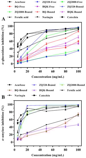 The inhibitions of α-glucosidase and α-amylase amongst four highland barley varieties were given in Figure 2 and Table 3. Overall, the α-glucosidase activity was significantly suppressed by acarbose, four highland barley varieties and three phenolic compounds in a concentration-dependent manner. At the concentration of 100 mg/mL, the inhibitory rates of ZQ320 and ZQ2000 bound extracts were 97.06% ± 1.35% and 96.29% ± 1.34%, respectively, which were higher than that of acarbose (93.44% ± 0.73%). Particularly, ZQ320 bound extract showed the highest suppressive effect on α-glucosidase at each concentration point. The inhibitory efficiency of inhibitor was assessed by median inhibition dose (IC50), and thus a lower IC50 indicated a stronger inhibition effect on α-glucosidase. The IC50 of acarbose was 4.62 ± 0.68 mg/mL (Table 3). According to the IC50 values of samples, it can be confirmed that HQK free fraction had the strongest inhibition effect, followed by BQ, and ZQ2000, and that of ZQ320 was the weakest. In terms of bound fraction, the suppression capacities were ranked as follows: ZQ320 > ZQ2000 > BQ > HQK. Notably, the bound extracts exhibited stronger inhibition effect than the free extracts among the four varieties, which suggested the bound phenolics as favorable α-glucosidase inhibitors. Furthermore, the IC50 of ferulic acid, naringin, and catechin (10.80 ± 0.90, 17.06 ± 0.62, and 8.04 ± 0.50 mg/mL, respectively) indicated that the inhibitory effect of highland barley was not caused by an individual compound but by the synergistic and additive effects of phenolics. Previous researchers suggested that ferulic acid, catechin, and quercetin could be used as competitive suppressors of α-glucosidase [30,31]. Tadera et al. [32] proposed that the α-glucosidase could be inhibited by hydroxyl substitution on the B ring or the presence of 3-OH, 4-CO and 2,3-double bond. Therefore, higher ferulic acid and quercetin contents of bound extracts than free fractions may be responsible for the stronger prohibition of α-glucosidase (Table 2).