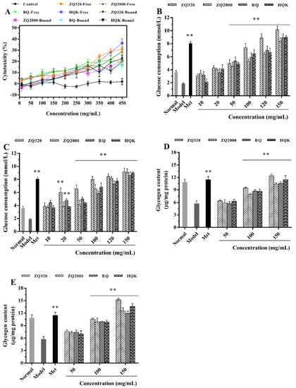 Cytotoxicity (A), glucose consumption of HepG2 cells in free (B) and bound (C) fractions, and glycogen accumulation of HepG2 cells in free (D) and bound (E) fractions of four highland barley varieties (mean ± SD, n = 3). ** Correlation is significant at the 0.01 level (2-tailed).