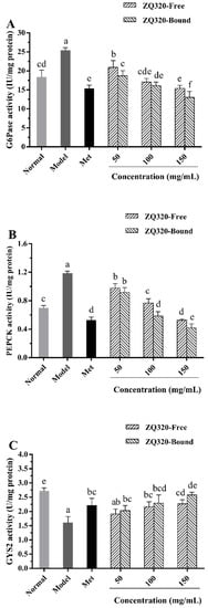 The concentration of glucose-6-phosphatase (G6Pase) (A), phosphoenolpyruvate carboxykinase (PEPCK) (B), and glycogen synthase 2 (GYS2) (C) activities of HepG2 cells in free and bound fractions of ZQ320 highland barley variety (mean ± SD, n = 3). Values with different letters in each bar differ significantly at p < 0.05.