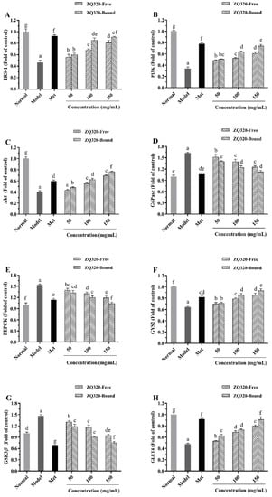 The gene expression of insulin receptor substrate-1 (IRS-1) (A), phosphatidylinositol 3 kinase (PI3K) (B), serine/threonine kinase (Akt) (C), G6Pase (D), PEPCK (E), GYS2 (F), glycogen synthase kinase 3β (GSK3β) (G), and glucose transporter type 4 (GLUT4) (H) of HepG2 cells in free and bound fractions of ZQ320 highland barley variety (mean ± SD, n = 3). Values with different letters in each bar differ significantly at p < 0.05.